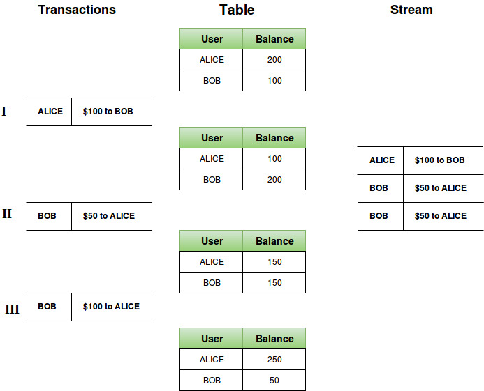 여기서 스트림은 한 계정에서 다른 계정으로 이체된 돈을 기록하는 거래 이벤트의 변경 불가능한 데이터를 나타냅니다.