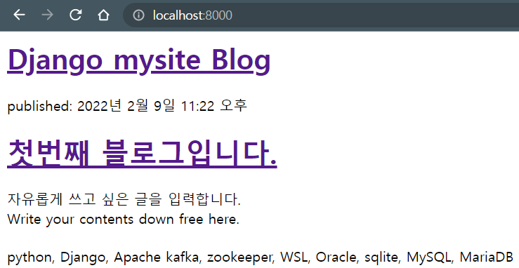 장고 관리자 인터페이스로 생성했던 글 목록이 출력됩니다.