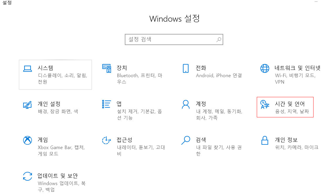 변경 방법은 [윈도우키] - [설정(톱니바퀴 모양)] 을 클릭하면 아래와 같이 윈도우 설정 화면이 나타납니다. [시간 및 언어] 메뉴를 클릭합니다.