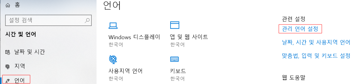 아래 화면이 나타나면 좌측의 [언어] 메뉴를 클릭한 후 우측 상단의 [관리 언어 설정] 메뉴를 클릭합니다.