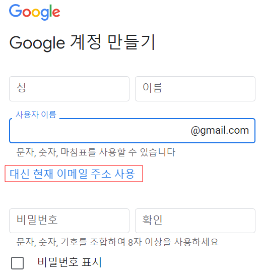 생성할 계정의 성과 이름을 입력합니다. 사용자 이름에는 기존에 gmail.com 계정이 있을 경우 기존 계정을 입력하고 다른 계정을 사용하고자 할 경우 "대신 현재 이메일 주소 사용"을 클릭한 후 이메일 주소를 입력합니다. 이 메일 주소가 구글 계정이 됩니다. 계정에 대한 비밀번호를 입력하고 [다음] 버튼을 클릭합니다.
