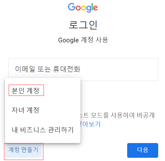 [계정만들기]를 클릭한 후 팝업되는 화면에서 [본인계정]을 선택합니다.