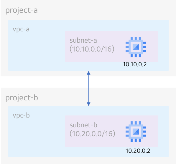 아래 그림과 같이 GCP에 2개의 프로젝트와 각각의 프로젝트 내에 VPC와 subnet 그리고 VM 인스턴스를 생성합니다.