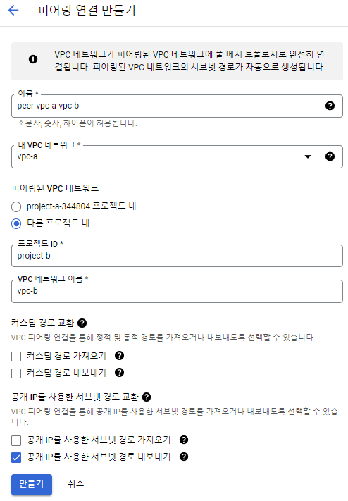 - VPC 네트워크 이름 : 연결대상 VPC 네트워크 이름 입력(vpc-b)