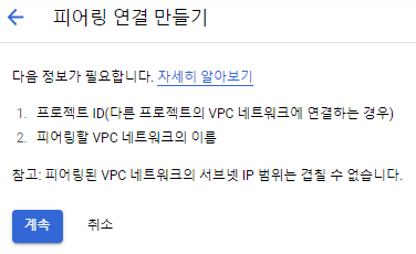 - 피어링된 VPC 네트워크 : 동일한 프로젝트 VPC일 경우와 다른 프로젝트 VPC를 선택할 수 있다. 본 문서에서는 "다른 프로젝트 내"를 선택