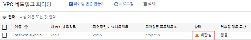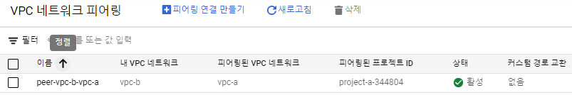 Project-A를 선택한 후 VPC 네트워크 피어링을 조회하면 상태가 "활성" 상태로 바뀐 것을 확인할 수 있습니다.