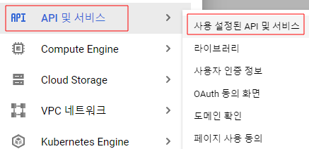 좌측 메뉴의 "API 및 서비스" - "사용 설정된 API 및 서비스" 메뉴를 클릭합니다.