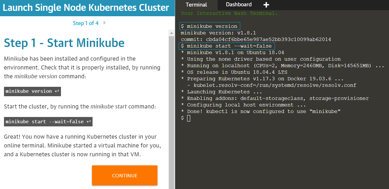 좌측 화면의 설명을 읽으면서 실습을 진행합니다. Step1은 minikube로 kubernetes cluster를 구성하는 실습입니다.