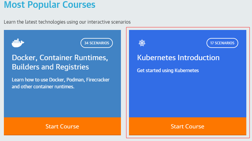 로그인 후 첫 페이지에서 "Kubernetes Introduction" 강의의 시작하기 위해 [Start Course]를 클릭합니다.