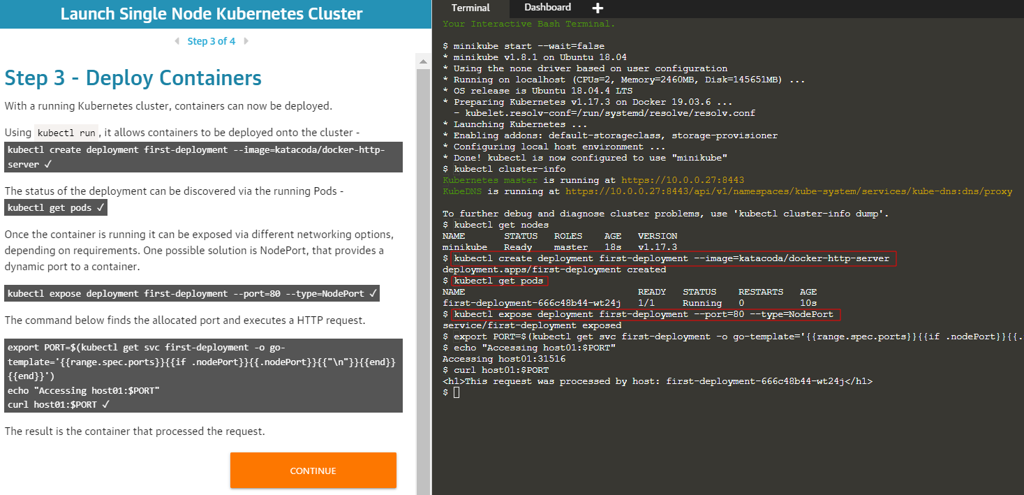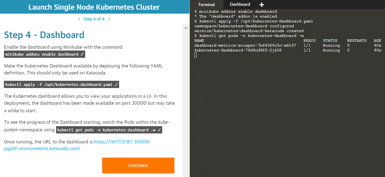 Minikube는 Kubernetes를 사용해 보거나 일상적으로 개발하려는 사용자를 위해 노트북의 VM 내에서 단일 노드 Kubernetes 클러스터를 실행합니다." 라는 설명이 나오면 "Start Scenario"를 클릭합니다.