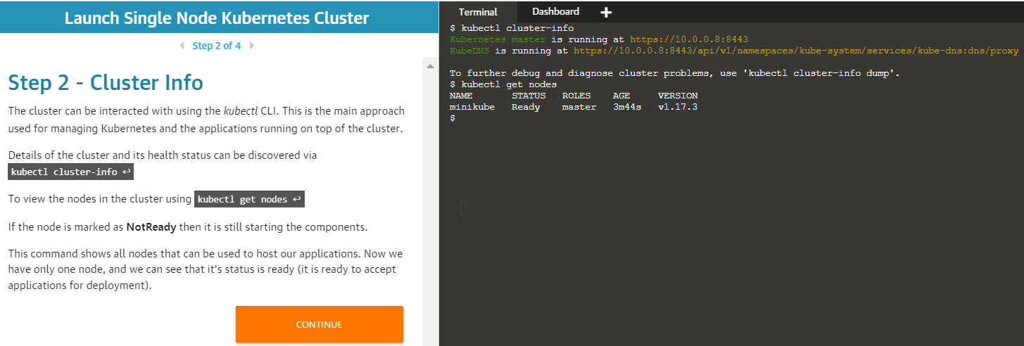 step 2에서는 kubectl 명령어로 클러스터 정보와 노드 정보를 확인해 봅니다. master node 가 있는 것을 볼 수 있습니다.