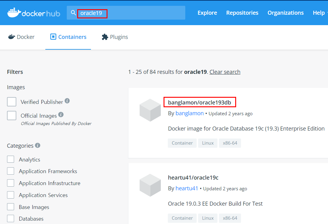 dockerhub(https://hub.docker.com/)에 접속하여 검색창에 oracle19를 입력하여 oracle image를 검색한다. Oracle19.3c 버전의 image가 검색된다. 본 문서에서는 Docker image for Oracle Database 19c (19.3) Enterprise Edition 이미지인 banglamon/oracle193db 이미지를 docker pull로 다운받는다.