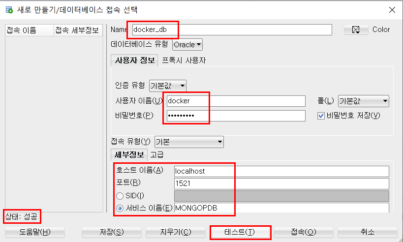 [테스트] 버튼을 클릭하여 정상 접속 여부를 확인한다. 올바르게 설정했으면 좌측 하단에 "상태 : 성공" 이라는 메시지가 출력된다.