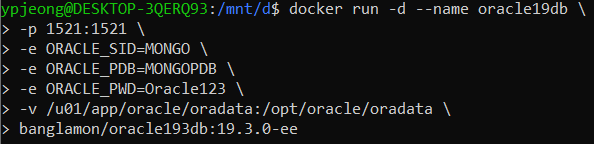 위 예제는 oracle193db 이미지로 detached mode로 컨테이너를 실행하고