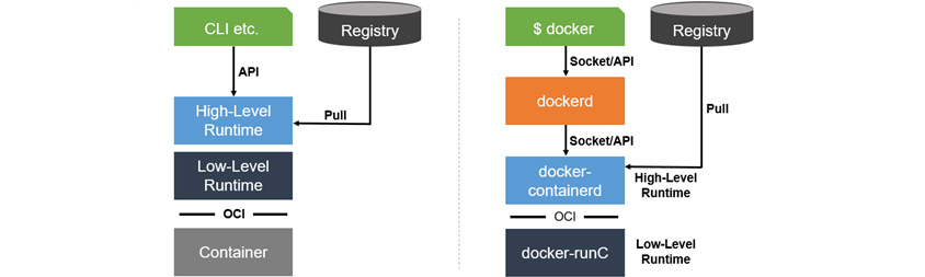 OCI가 만들어질 당시 비공식적 표준 역할을 하던 도커는 컨테이너 런타임의 표준화를 위해 필요한 모든 단계가 아닌 세 번째 단계인 컨테이너의 실행 부분만 표준화하였습니다. 이로 인해 컨테이너의 런타임은 실제 컨테이너를 실행하는 저수준 컨테이너 런타임인 OCI 런타임과 컨테이너 이미지의 전송 및 관리, 이미지 압축 풀기 등을 실행하는 고수준 컨테이너 런타임으로 나뉘게 되었습니다.