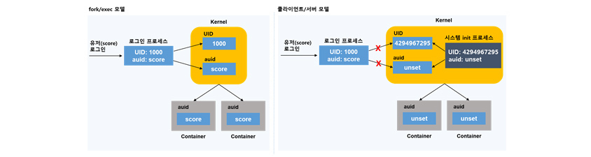 그림 6은 fork·exec 모델 및 클라이언트-서버 모델에서의 UID, auid 설정 동작 방식이 있으며, 클라이언트 - 서버의 경우 컨테이너 이미지 빌드, 관리, 공유 같이 많은 기능이 이 있어 무겁고 장애 발생 시 모든 자식 프로세스에 영향을 미치게 된다는 것을 보여주는 그림[그림 6] fork·exec 모델 및 클라이언트-서버 모델에서의 UID, auid 설정 동작 방식