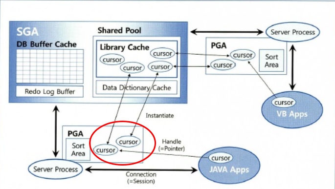 공유 커서 (shared cursor) : 라이브러리 캐시에 공유돼 있는 Shared SQL Area