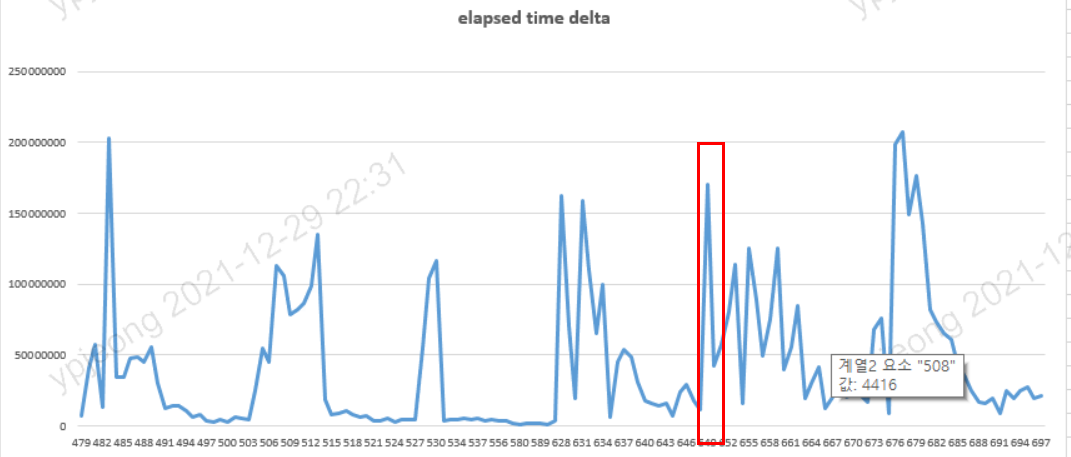 elapsed_time_delta 값의 추이도 장애 시점 상 특이사항이 보이지 않는다.