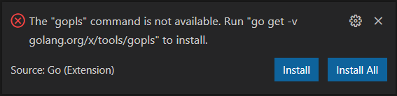 설치가 완료되면 아래 화면이 나타나는데 "Install All" 버튼을 클릭하여 GO 관련 extension을 모두 설치합니다. 정상적으로 설치가 완료되면 "All tools successfully installed. You are ready to Go. :)" 메시가 출력됩니다.