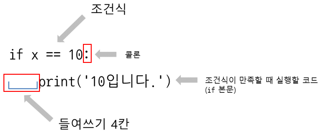 if 조건문은 if에 조건식을 지정하고 반드시 무장 끝에 :(콜론)을 붙이며 elif, else에도 문장 끝에 :(콜론)을 붙여야 합니다.