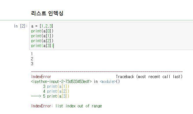 a[3]은 없는 인덱스이기 때문에 당연히 index out of range라는 에러가 나오게 됩니다.