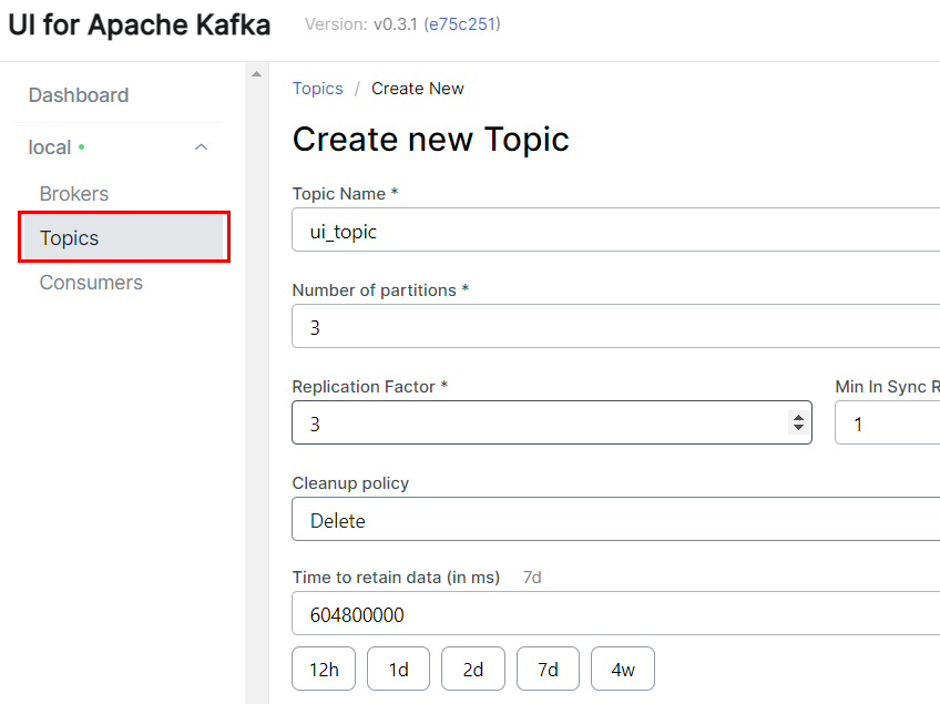 Topic을 하나 생성한 후 카프카 브로커에서 조회해 봅니다. topic 이름은 ui_topic 이름으로 설정하고 partitions은 3, Replication Factor도 3으로 설정한 후 생성했습니다.