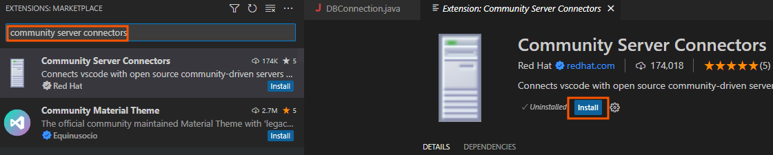 VSCode 좌측메뉴의 Extensions에서 "community server connectors"를 검색합니다.검색 후 Community Server Connectors를 [install] 버튼을 클릭하여 설치합니다.
