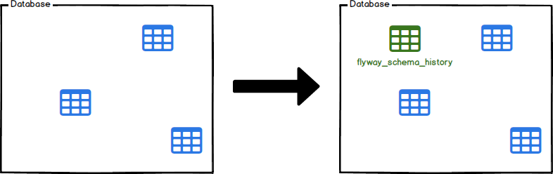 스키마에 테이블이 존재할 경우에는 flyway baseline 또는 flyway migrate -baselineOnMigrate=true 명령어를 수행해야 합니다. baselineOnMigrate=true 옵션은 baseline을 설정하고 migrate을 수행합니다.