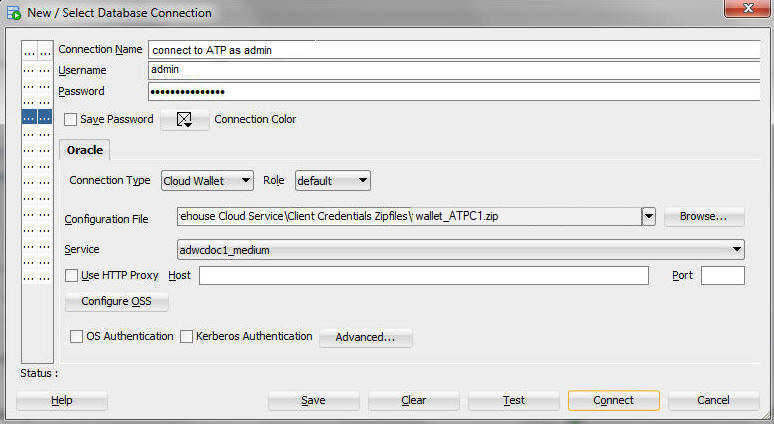 Password - Enter theadminuser's password that you or your Autonomous Transaction Processing administrator specified when creating the service instance.