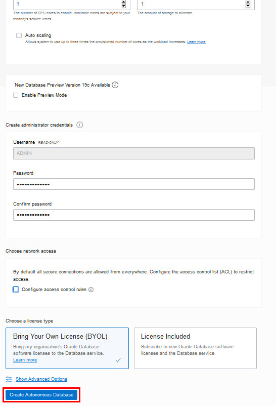 Enable Preview Mode- For this tutorial, do not activate this option. Oracle periodically provides a preview version of Autonomous Database. You can enable the preview mode to test your applications and become familiar with features in the next release of Autonomous Database.