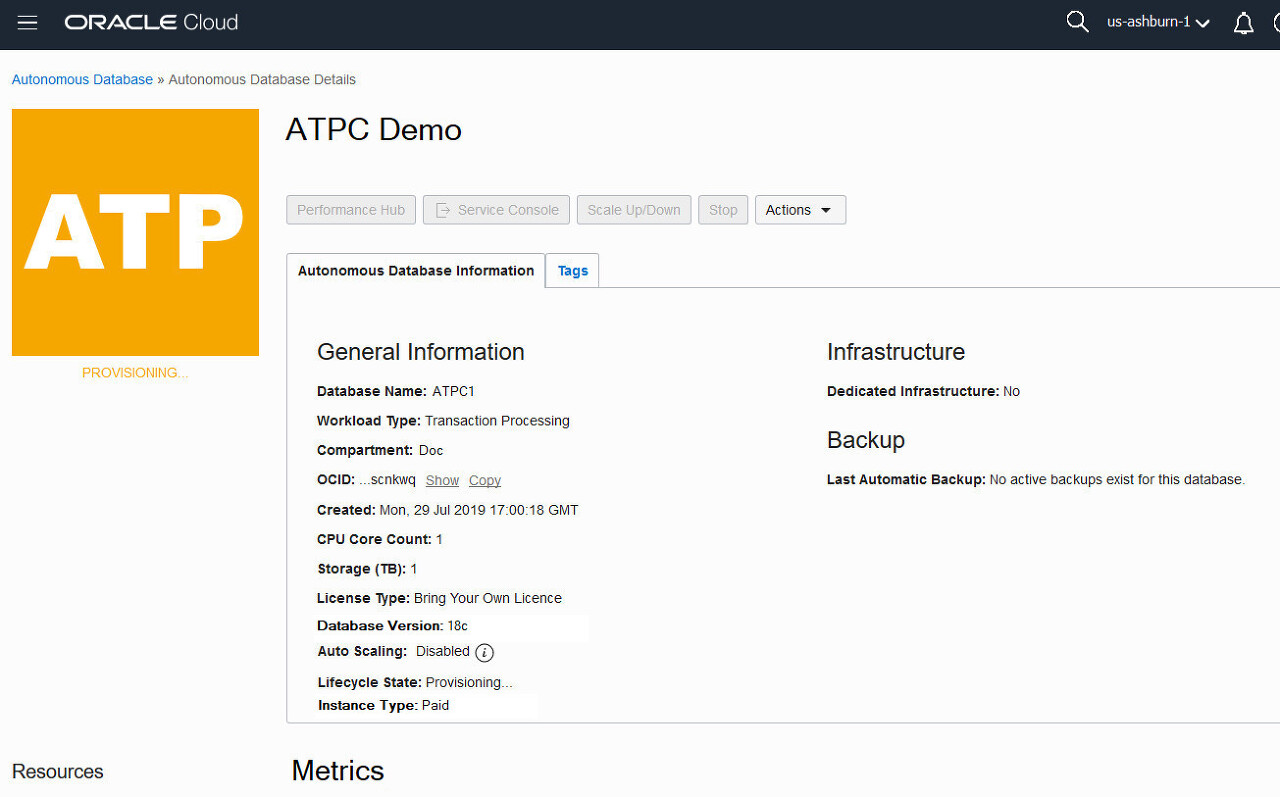 The Create Autonomous Database dialog closes. On the console, the Lifecycle State field indicates that the database isProvisioning. When creation is completed, the Lifecycle State field changes toAvailable.Description of the illustration provisioning_state
