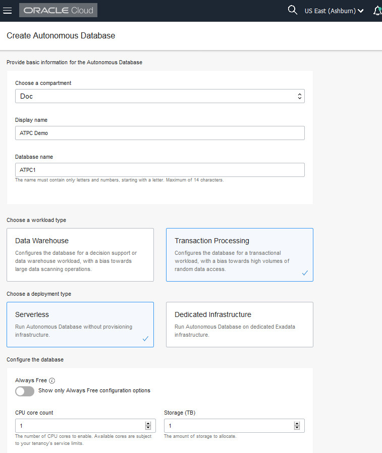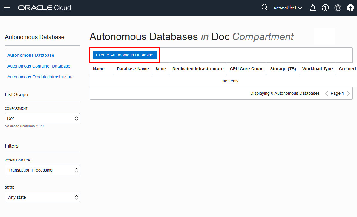The console for Autonomous Database displays. You can use theList Scopedrop-down menu to select a compartment; in this example theDoccompartment is selected. Clickherefor documentation on creating compartments. This console shows no databases. If there were a long list of databases, you could filter the list by using theFiltersdrop-down menu to filter by the state of the databases (available, stopped, terminated, and so on). You can also sort by workload type. Here Transaction Processing is selected. ClickCreate Autonomous Databaseto create a database instance.Description of the illustration create_autonomous_transaction_processing_database
