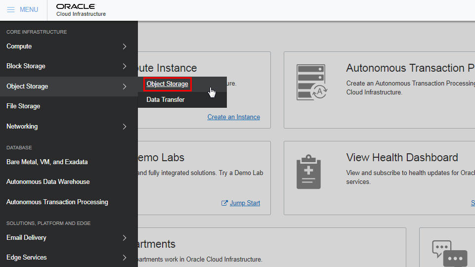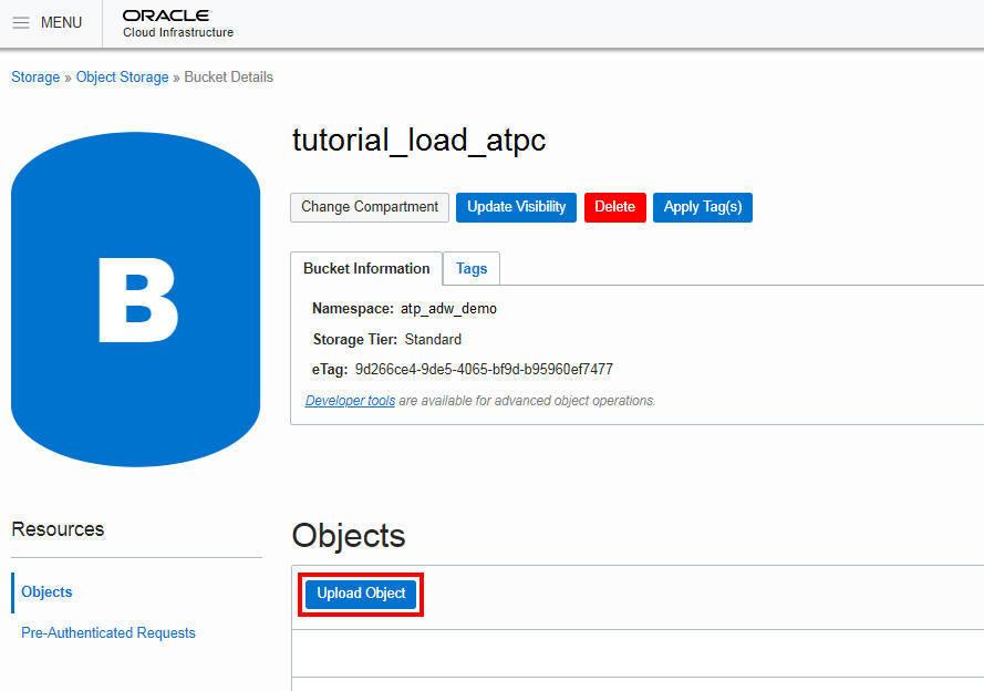Upload to your cloud-based object store the data files that you want to load to your Autonomous Transaction Processing database. This tutorial uses an object store in the Oracle Cloud Infrastructure Object Storage service.