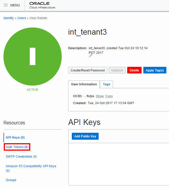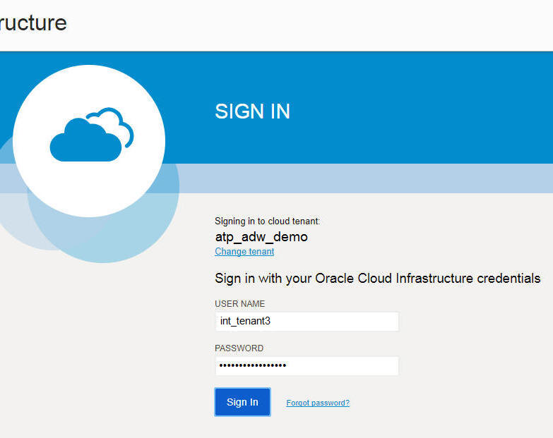 Log in to your Oracle Cloud Infrastructure Console with the following credentials provided by your Oracle Cloud administrator: cloud tenant, user name, password.