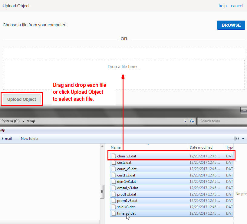 Navigate to the location of the data files on your local computer. Drag and drop each file individually or click Upload Object to upload each file individually. This example uploads the data files of the SH tables (sales history tables from an Oracle sample schema). Click here to download a zip file of the 10 SH data files for you to upload to the object store. Unzip the data files from the zip file, because zip files cannot be uploaded. Upload each unzipped data file individually. Note: Alternatively, you can use curl commands to upload large numbers of files.