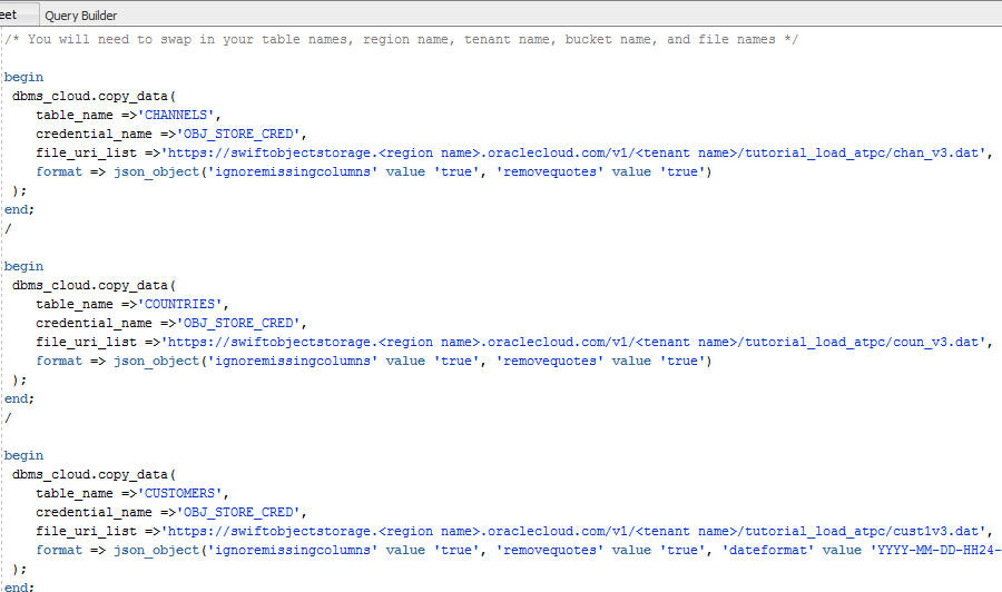 The copy_data procedure of the DBMS_CLOUD package requires that target tables must already exist in in your Autonomous Transaction Processing database. In the previous tutorial in this series, Connecting SQL Developer and Creating Tables,you created in your Autonomous Transaction Processing atpc_user schema all of the target tables.