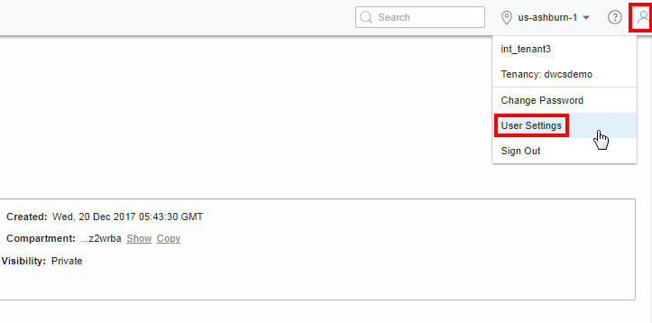 Hover your mouse cursor over the human figure icon at the top right of the console and click User Settings from the drop-down menu.