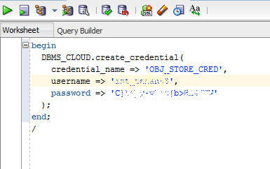 In a SQL Developer worksheet, use the create_credential procedure of the DBMS_CLOUD package to store the object store credentials in your atpc_user schema.
