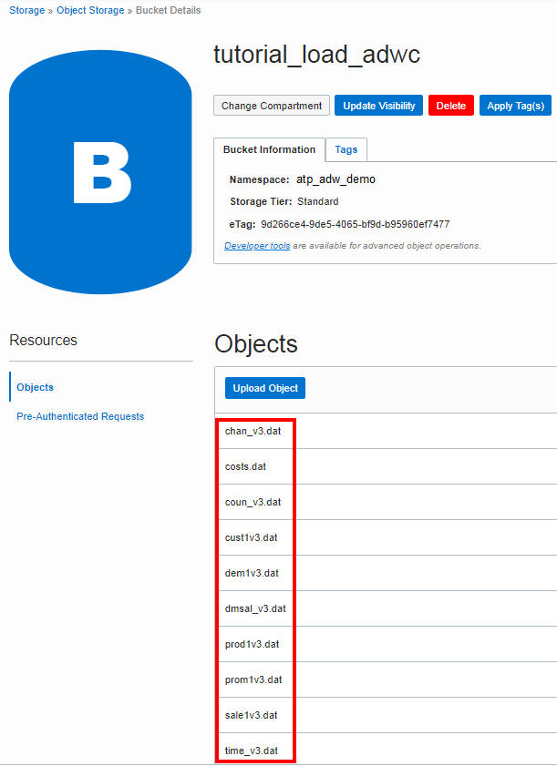 The data files are uploaded to the bucket. These files staged in the cloud are ready to be copied into the tables of your Autonomous Transaction Processing database. Remain logged in to Oracle Cloud Infrastructure Object Storage.