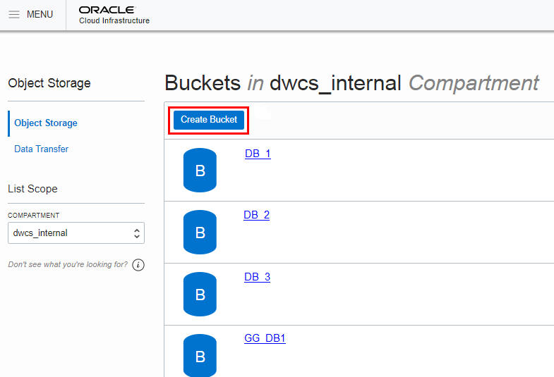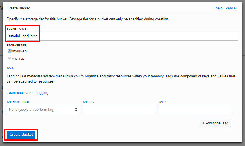 Click Create Bucket to create the storage bucket in which to upload your source files. You will later copy this staged data into tables in your Autonomous Transaction Processing database.