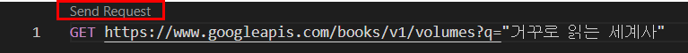 GET https://www.googleapis.com/books/v1/volumes?q="거꾸로 읽는 세계사" 를 입력 후 [Send Request]를 클릭합니다.