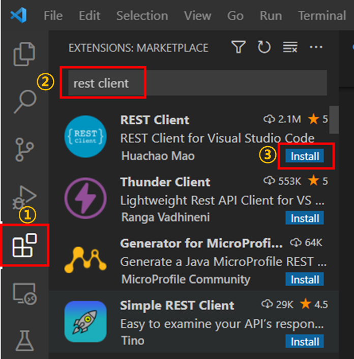 VSCode 의 extension을 클릭한 후 검색창에 rest client 을 입력합니다.